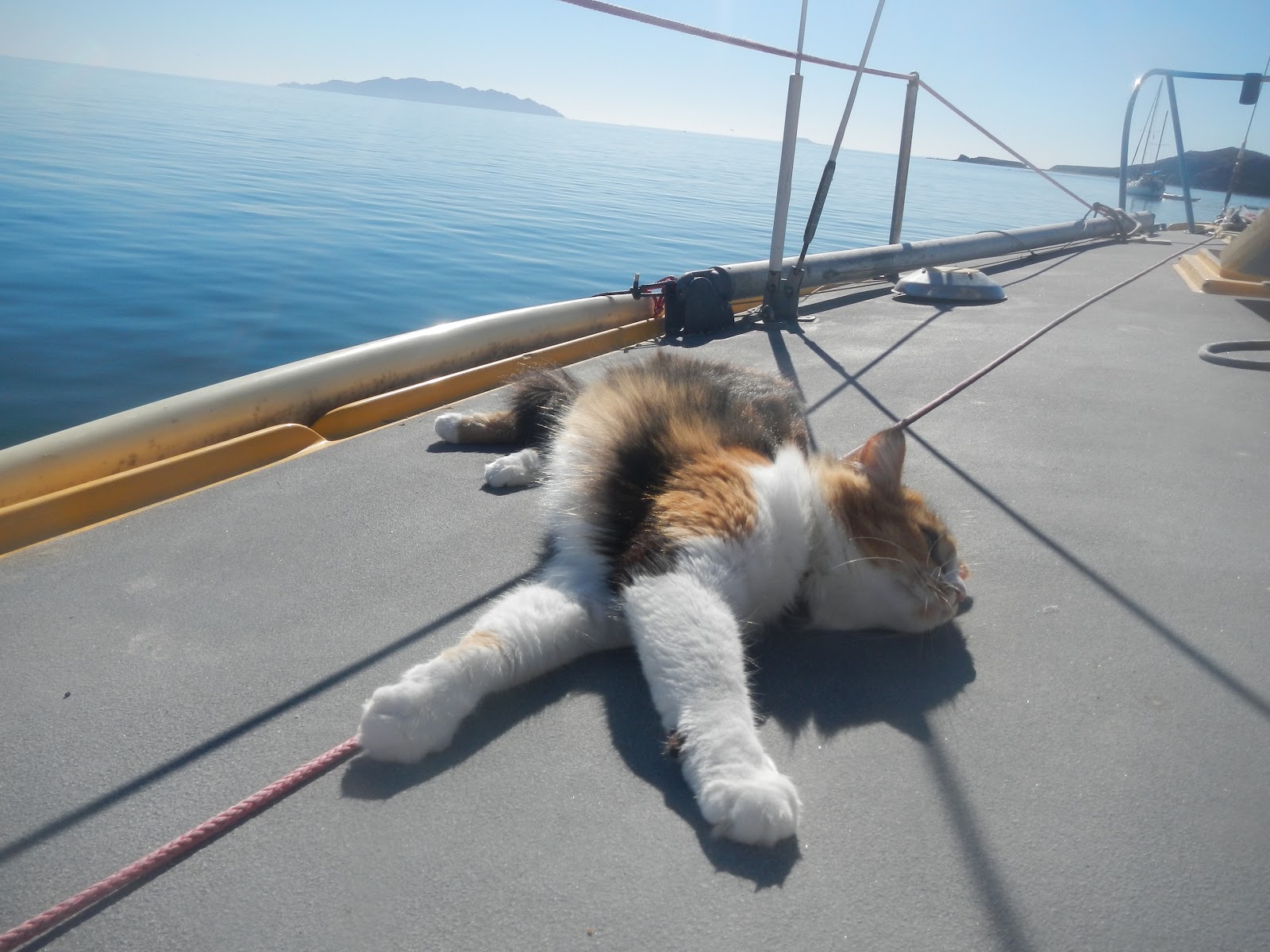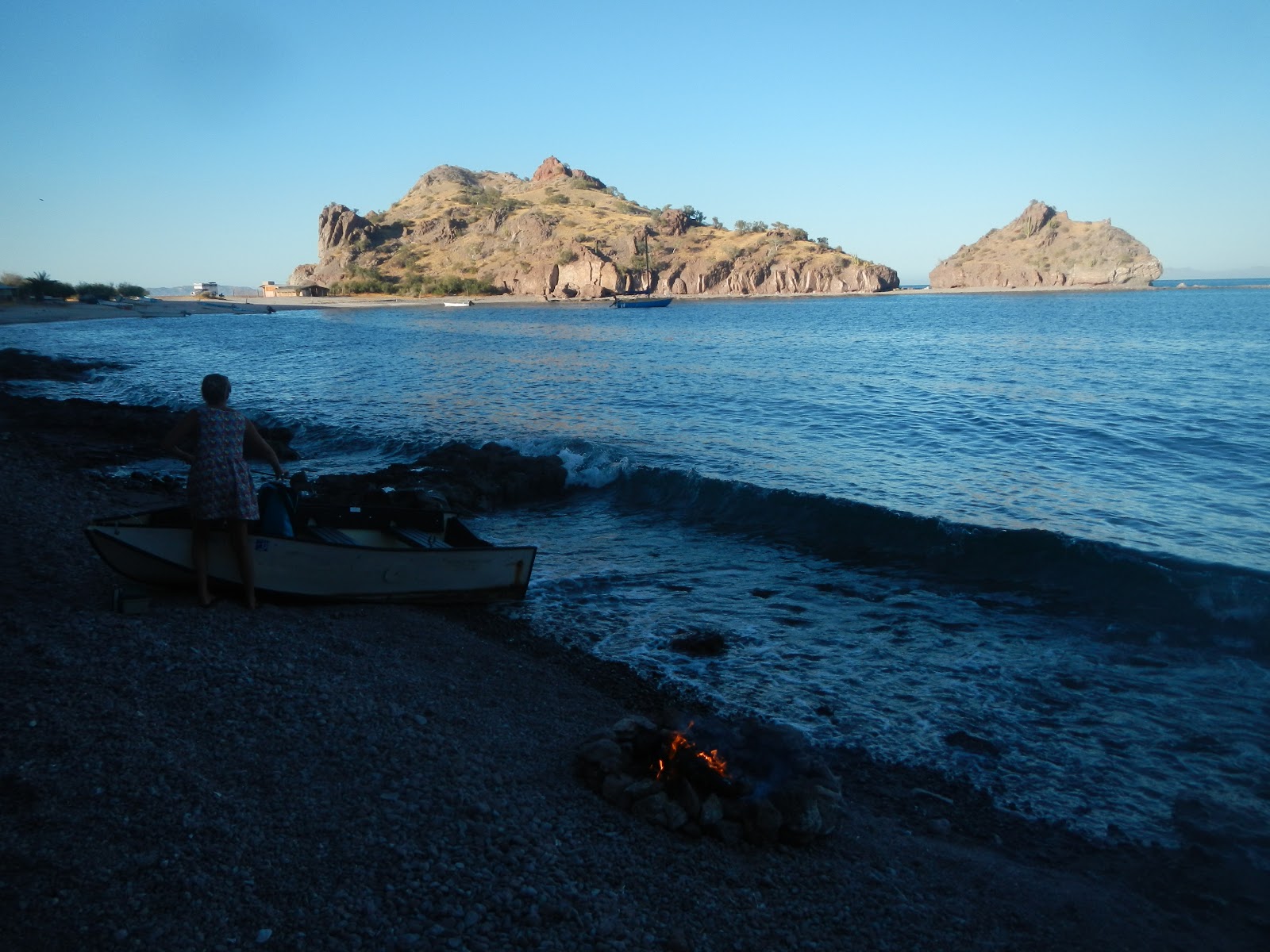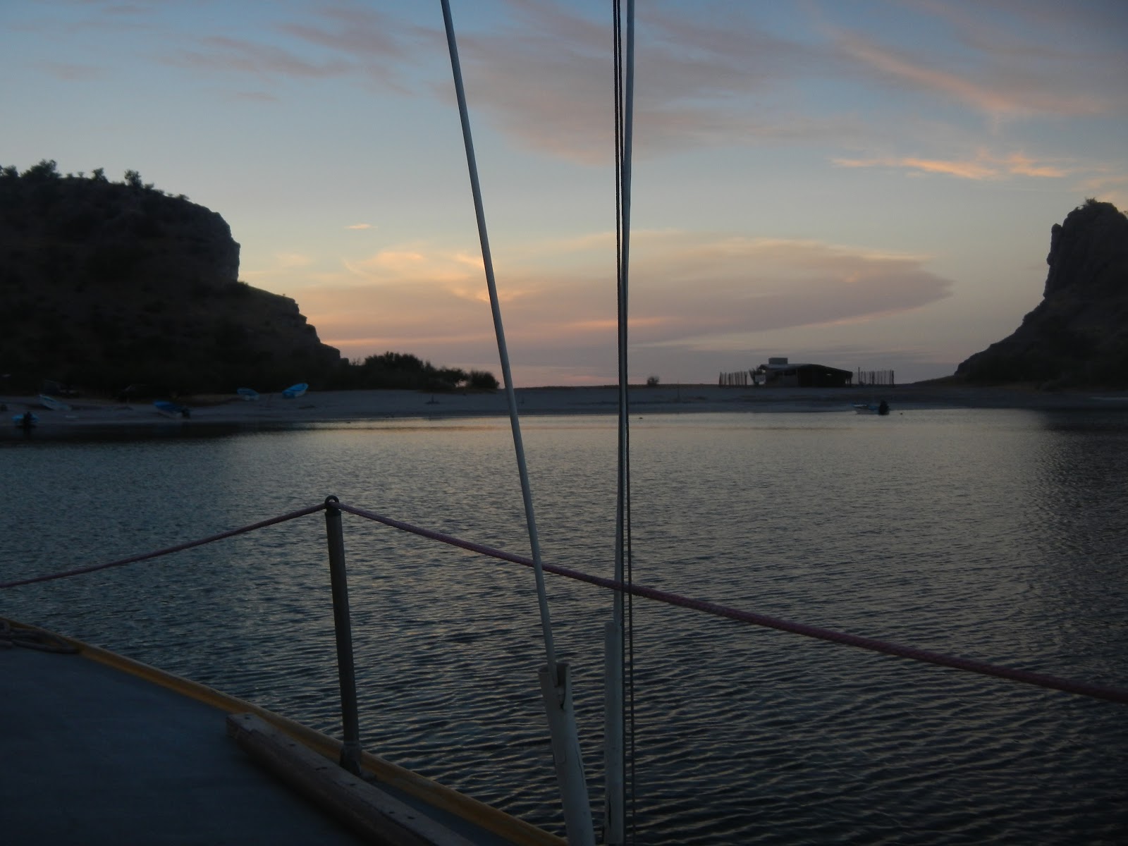 3/23 Getting ready to head out of Agua Verde towards Puerto Escondido. About 20 miles. We need to refill on water for my mother’s visit. Anchor up at 9:00AM. Motor sailing at 5 kts with very light wind. 14:30 tied to the fuel dock in Puerto Escondido. Our Swiss friends are here! But they were on their way out, 3 miles across the channel to a more secluded anchorage. After topping off on water, Claire and I left ‘Splendid Isolation’ and Piña at the fuel dock and went to the restaurant for email and skype. It’s been at least 2 weeks with no communication! Anchor down at 18:30 in one of many calm nooks in this fascinating bay.