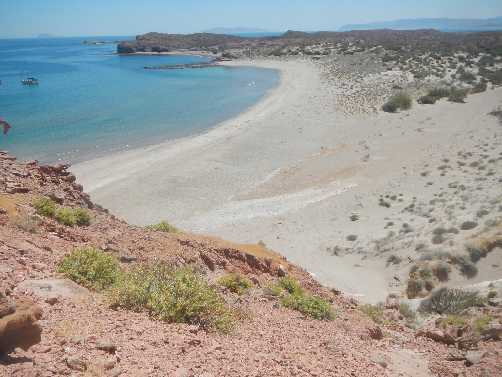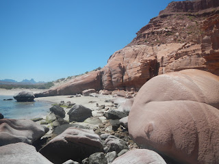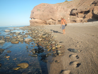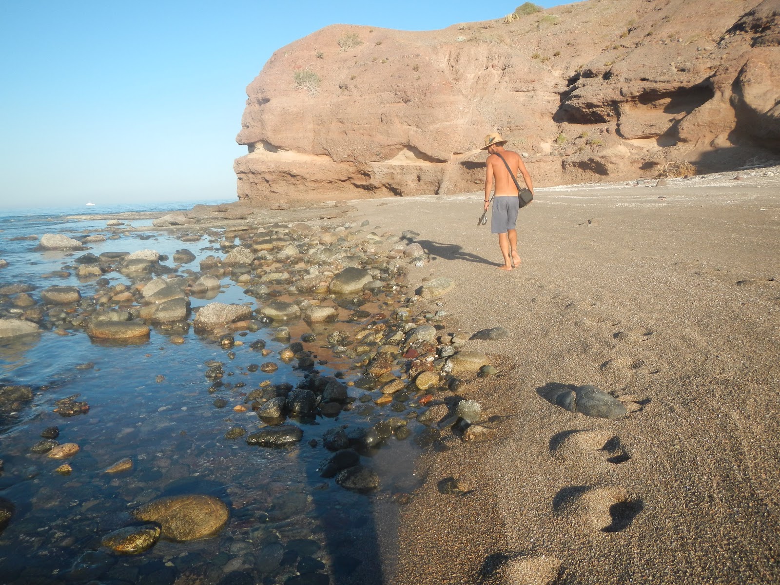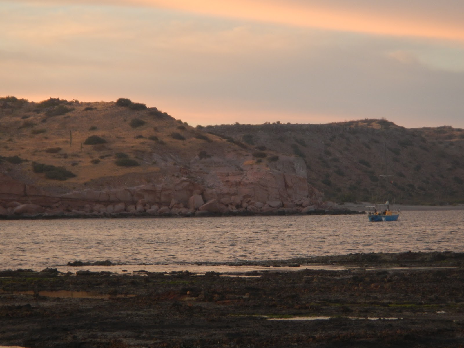 3/18 Slept like a rock. New boat on anchor this morning “strider”. Dozen dolphins feeding along the steep shoreline. Dead calm glass. 9:00 Claire pulled up the anchor again! 10:00 sailing towards Bahia el Gato (puerto gato) light SSE wind. Gliding at 4 kts! Calm out. Got up to 5 kts wing and wing for a while. “strider” passed us. 12:00 wind died. Depth sounder showing 2200 ft of water! 13:00 saw a blue whale! Its back came up breaking the surface exposing its full tail and fin. 14:00 light wind motor sailing with the jib about 6 miles til Gato. 15:00 anchor down in the Toro side. One other boat. Immediately rowed to shore! Smooth red bluffs, very intriguing. We walked out to Punta Botella along cobblestone beaches. The cliffs were filled with every kind of precious stone. layers deep of sediment and stones that go on for centuries. Anchovies in the tide pools. This bay is not very protected from the swell but it’s calm out so we’re chancing it. Planning on staying here tomorrow too.