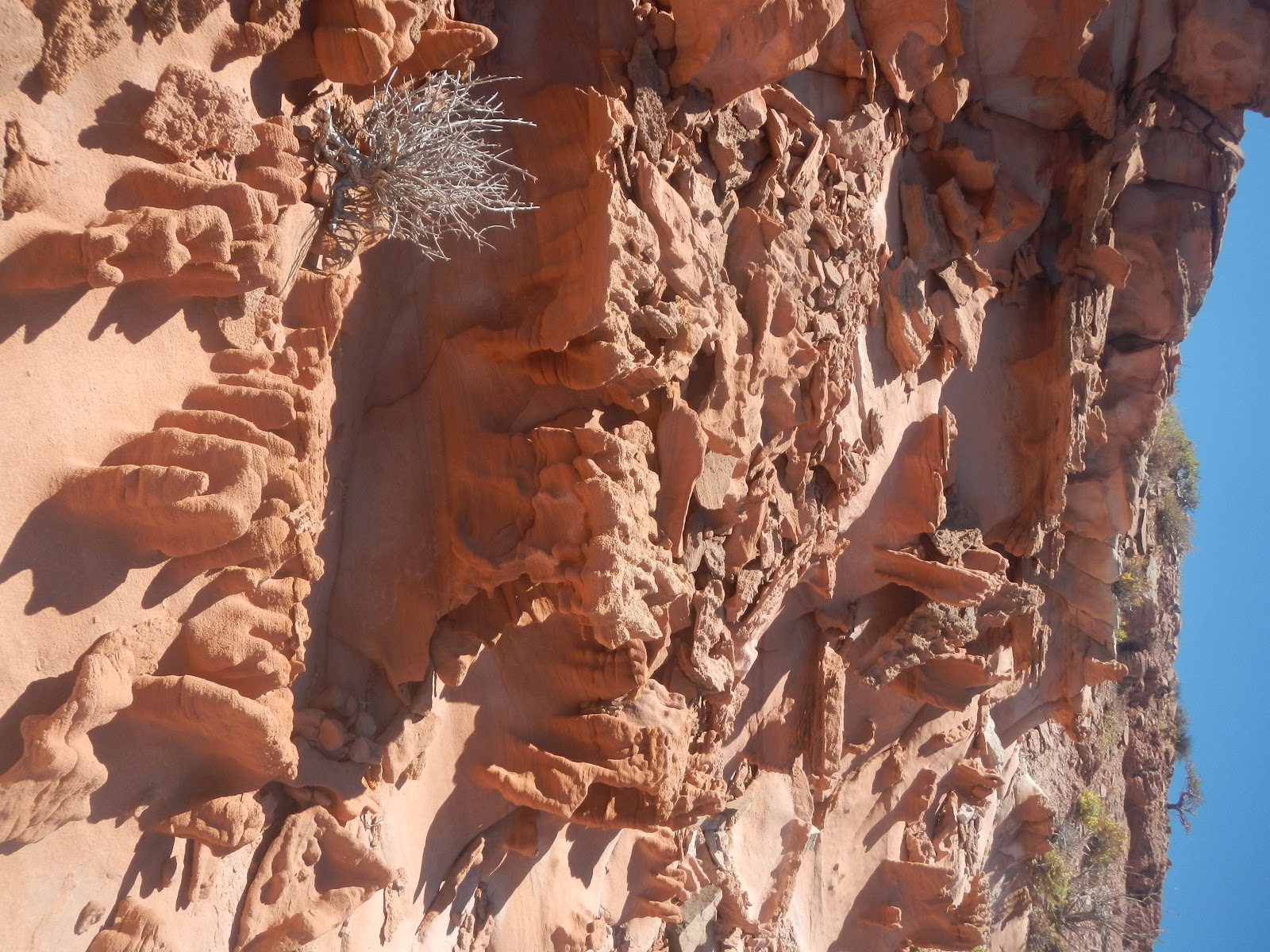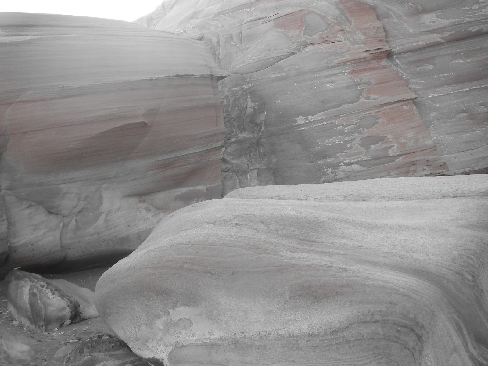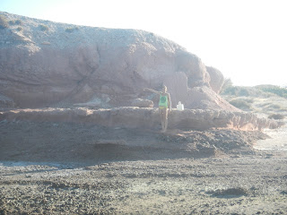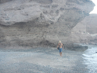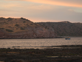 3/18 Slept like a rock. New boat on anchor this morning “strider”. Dozen dolphins feeding along the steep shoreline. Dead calm glass. 9:00 Claire pulled up the anchor again! 10:00 sailing towards Bahia el Gato (puerto gato) light SSE wind. Gliding at 4 kts! Calm out. Got up to 5 kts wing and wing for a while. “strider” passed us. 12:00 wind died. Depth sounder showing 2200 ft of water! 13:00 saw a blue whale! Its back came up breaking the surface exposing its full tail and fin. 14:00 light wind motor sailing with the jib about 6 miles til Gato. 15:00 anchor down in the Toro side. One other boat. Immediately rowed to shore! Smooth red bluffs, very intriguing. We walked out to Punta Botella along cobblestone beaches. The cliffs were filled with every kind of precious stone. layers deep of sediment and stones that go on for centuries. Anchovies in the tide pools. This bay is not very protected from the swell but it’s calm out so we’re chancing it. Planning on staying here tomorrow too.