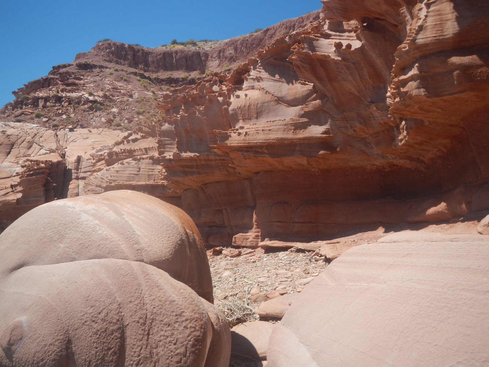 3/18 Slept like a rock. New boat on anchor this morning “strider”. Dozen dolphins feeding along the steep shoreline. Dead calm glass. 9:00 Claire pulled up the anchor again! 10:00 sailing towards Bahia el Gato (puerto gato) light SSE wind. Gliding at 4 kts! Calm out. Got up to 5 kts wing and wing for a while. “strider” passed us. 12:00 wind died. Depth sounder showing 2200 ft of water! 13:00 saw a blue whale! Its back came up breaking the surface exposing its full tail and fin. 14:00 light wind motor sailing with the jib about 6 miles til Gato. 15:00 anchor down in the Toro side. One other boat. Immediately rowed to shore! Smooth red bluffs, very intriguing. We walked out to Punta Botella along cobblestone beaches. The cliffs were filled with every kind of precious stone. layers deep of sediment and stones that go on for centuries. Anchovies in the tide pools. This bay is not very protected from the swell but it’s calm out so we’re chancing it. Planning on staying here tomorrow too.