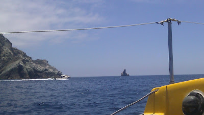 when i was talking about putting the stern anchor out to keep us from rocking so much, i took it out on the dinghy and dropped it close to that rock so our stern moved down in the photo and our bow was cutting threw the little waves coming straight into the cove.