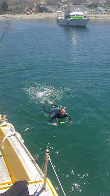Moored in Two Harbors. front row to the beach and little cottages. Totally different vibe from the touristy Avalon. Here is rolling grass hills with scattered palms. Strong breeze blowing through the isthmus. took dinghy a couple miles to a small beach. rippers cove. snorkeled and saw stingrays.
