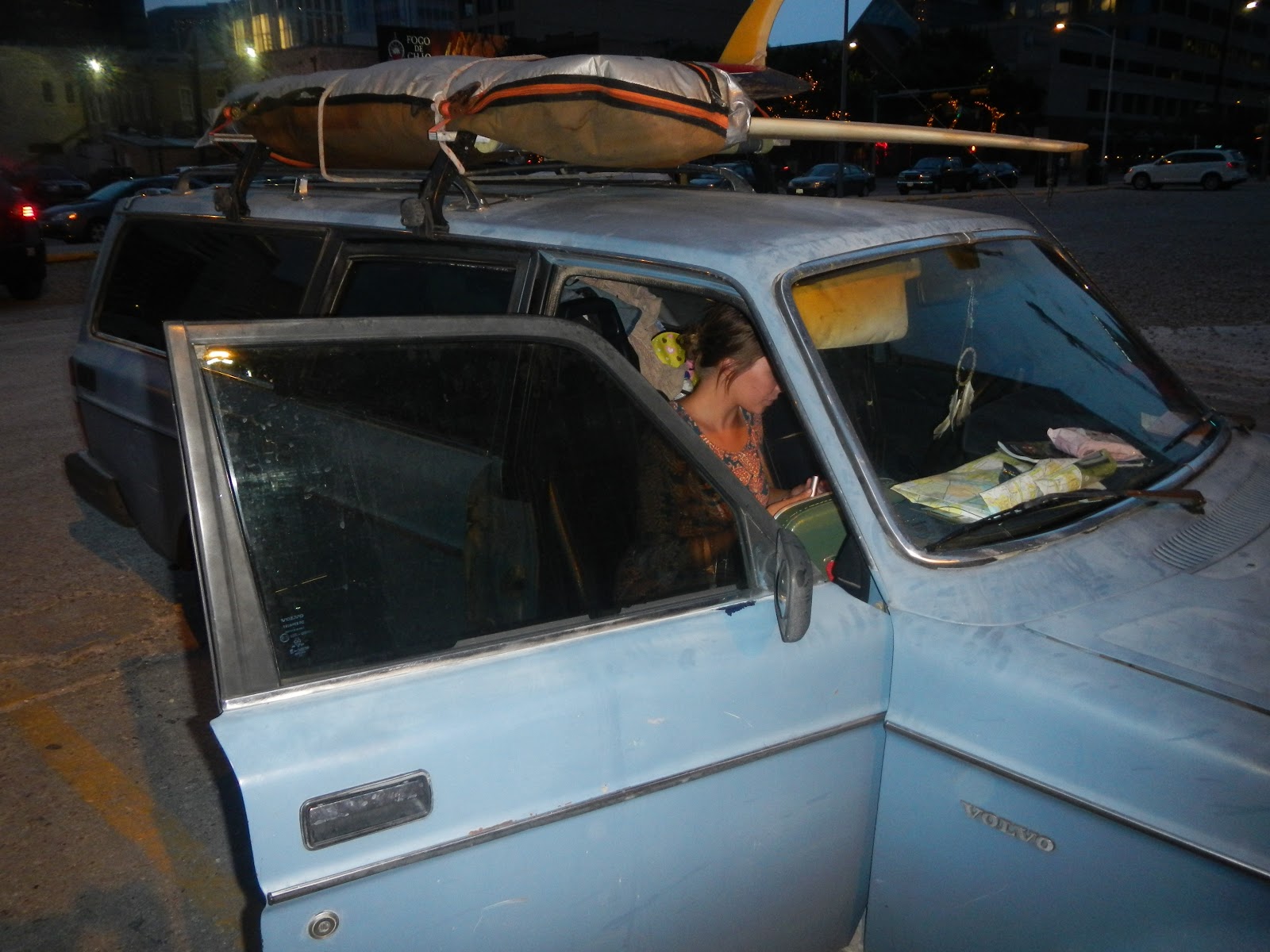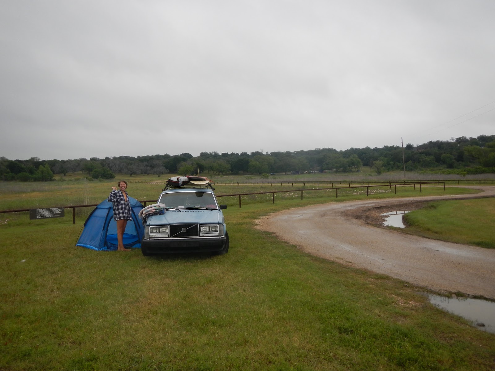 5/14 Woke up to every kind of bird noise. Peacocks, turkeys, guinea hens, roosters, morning doves. Stumbled into the office for coffee. Went on the cavern tour. We saw 2 miles of over 7 miles of underground trails and rooms. It was literally out of this world. We gave the lady in the office some rocks we found on the North side of San Everisto. She had no idea what they were. A Doctor Geologist is coming there in 2 weeks. She’s going to have him run tests on them and email us the info! We’re hoping they’re something special because we have a whole freezer bag full. After that we got on 290 through Hill Country. Beautiful rolling hills. We saw an armadillo, porcupine, horses, cows, antelope, deer, sheep, and goats. The highway was lined with wild flowers, dill, sage, and lavender. Fields of pecan, walnut, almond, and peach trees. We stopped for a wine tasting in Fredricksburg. Only #2 to Napa in the states for wineries! We had some really good Texas wines from old-world grapes, who knew!? Got back on the highway to Austin. Stopped at Malaga restaurant for tapas and wine! Austin seemed to be a funky, hip city. I called it the “anti-texas”. We were planning to meet up with a highschool friend of mine for the night, that I haven’t seen in over 7 years, but timing didn’t work out. So we got on the 35 north to Belton Lake. We found the Owl Creek campground, which was free! High winds. Popped the tent at 1:00AM on the lee-ward side of the Volvo. Of course our first thunderstorm in over a year explodes open during the night!