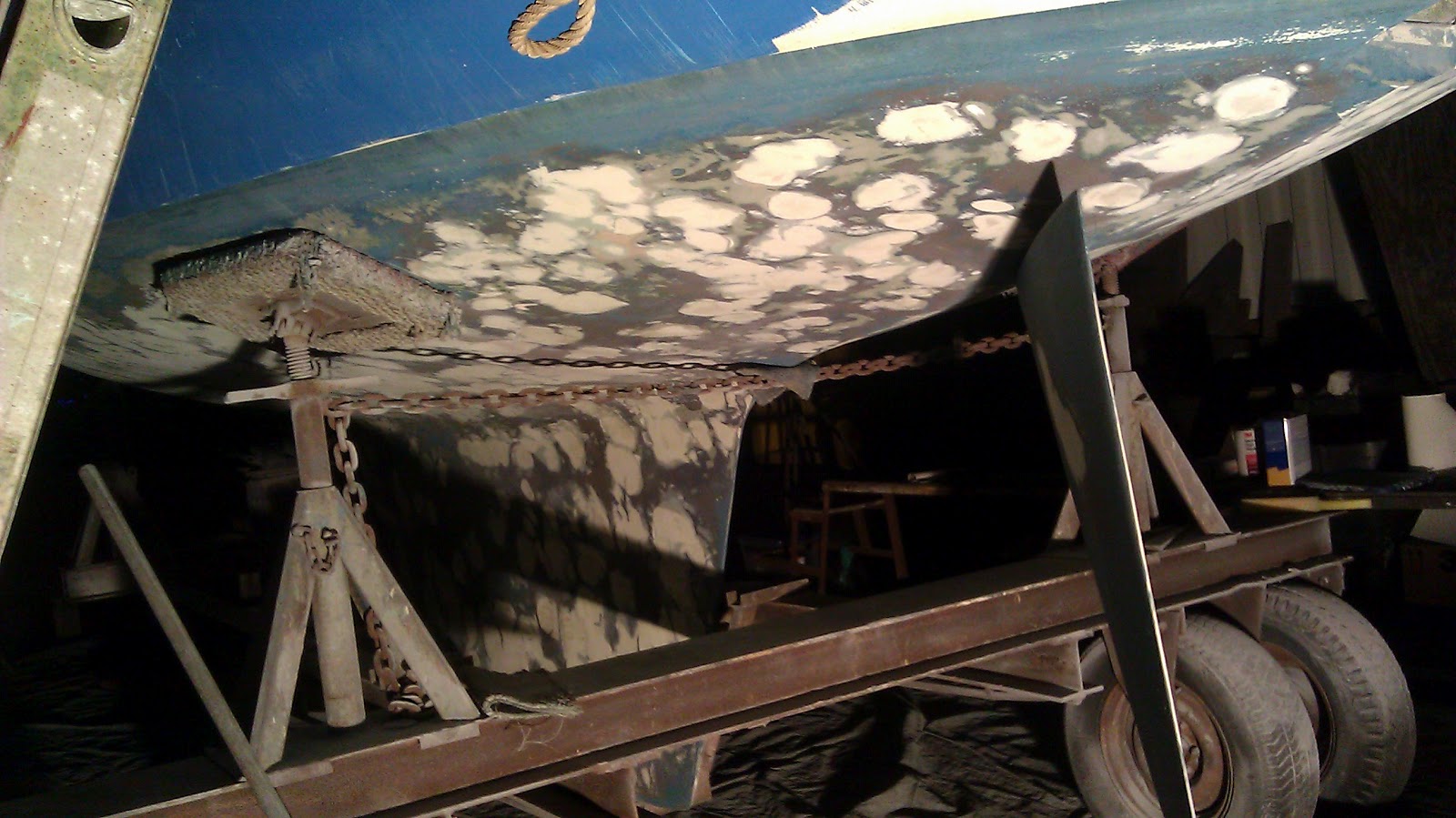 Once we got her out, hosed off, and onto the trailer. Rex (dana point yacht maintenance) pointed out the 300-500 blisters 🙁