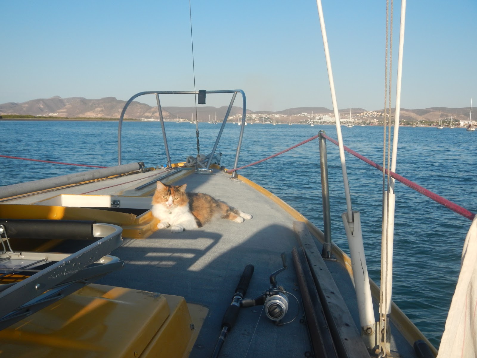 1/28 Heading to La Paz. We left Muertos at 3:30AM with SSW wind on our stern. Full moon. We had a great sail up the Cerralvo channel. Changed to west wind. Beam reach. We hit 6.5 and 7 kts. for a few hours. We got to the Lorenzo channel and it was gorgeous out. We had such a great sail and made it there a few hours ahead of schedule! Once we got inside the calm bay we set the auto-tiller. Changed our clothes, freshened up, dropped the sails, and cleaned the cockpit. Our original plan was to head to Lobos and anchor there for a night with ‘Sweet Dreams’. We were worried because they had not left with us that morning and could not reach them on the radio. Later we found out they decided to stay in Muertos a few more days. They woke up early and didn’t like the strong wind, even though it was all on the stern. With that, we decided to skip Lobos and head straight to La Paz and get a slip in a marina. This way we could have our outboard serviced a lot easier. Sexy yamaha 8hp going strong down Baja needed some professional attention. Heading towards La Paz, we radioed a few marinas and got a slip reservation. We were close to the marina and turned towards it. ERRRR stuck… La Paz is known for its drifting shoals… well we didn’t plan for this. We only charted to Lobos.. We were grounded, first time ever. About 5 foot of water, sandy bottom. I threw it in reverse while claire scuttled the tiller back and forth. We turned right off it and kept on our way. We hit 2 more shoals, 3 total! Ugh. We were surrounded by them! Finally we saw a power boat zooming fast with no worries, and noticed his wake breaking over the shoals. This helped us find our path back up to the channel entrance. They have a dredged channel up the side of the bay, marked with buoys. Sounds nice. But it’s mexico. The entrance to the channel was blocked by an anchored cargo freighter, buoys were drifted from the past windy blows. If we had planned and charted accordingly we definitely wouldn’t have hit shoals, but the obstacles were no help. We finally pulled into Palmira Marina and settled in. The marina office informed us that we were missing a document that no one else had told us about since being in mexico. A temporary boat import permit. It lasts 10 years. 1/29 we woke up early and headed to Pichilingue to get our temporary boat import permit. We took the bus there. Waited in line. They wanted our originals of every paperwork (which we keep in our safe)!!! We only carry copies. Had to hitchhike back to the marina, get the originals, hitchhike back to the office. Took care of business and had a scenic bus ride home. 1/30 claire did some of her laundry. Sea Otter jimmy came to take our Yamaha. He sailed down 25 years ago from California, when he was 25. Heading to town to get groceries. 2/4 After a week in the slip it was time to move out to the Magote anchorage. It’s a mix between a channel, the sound, and mangroves. The current is nasty strong, in and out, depending on the tide. The current dominates the wind strength, usually. Its quite tricking to anchor. Normally the bow faces into the wind and tugs on the anchor line. This is different. The current tugs on the boat while the wind and wind waves shift her around. Here our anchor line comes off the boat more like a check-mark, while we swing 180degrees a few times a day. 2/10 Carnaval is going on! We have been working on the boat and enjoying downtown La Paz. There was a swap meet this morning between most of the boaters in the area. Every swap meet I’ve heard of starts at sunrise…not in mexico. We were a few hours early. Our dinghy was filled up with everything we did not need on the boat. Took that to shore and wheeled it over in our sweet fold up cart. Claire even baked fresh biscotti the night before and portioned it into baggies to sell! Laid out a canvas and let the selling begin! We were selling stuff before we could even lay it down. I told claire “we are going to the swap meet with a pile of junk and 23 pesos (about $1.90) and as long as we come home with a smaller pile and a little bit of cash, we had a good day.” well damn. We came home with hardly anything and 1594.5 pesos (about $130!). Pretty damn good for 4 hours of hustling junk. Well this is it for La Paz. We are still here waiting for some packages before we continue north up the sea of cortez.