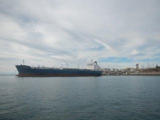 this tanker was blocking the channel entrance, which is to the right of the photo. this is us backtracking. we came in on the left side of this photo.