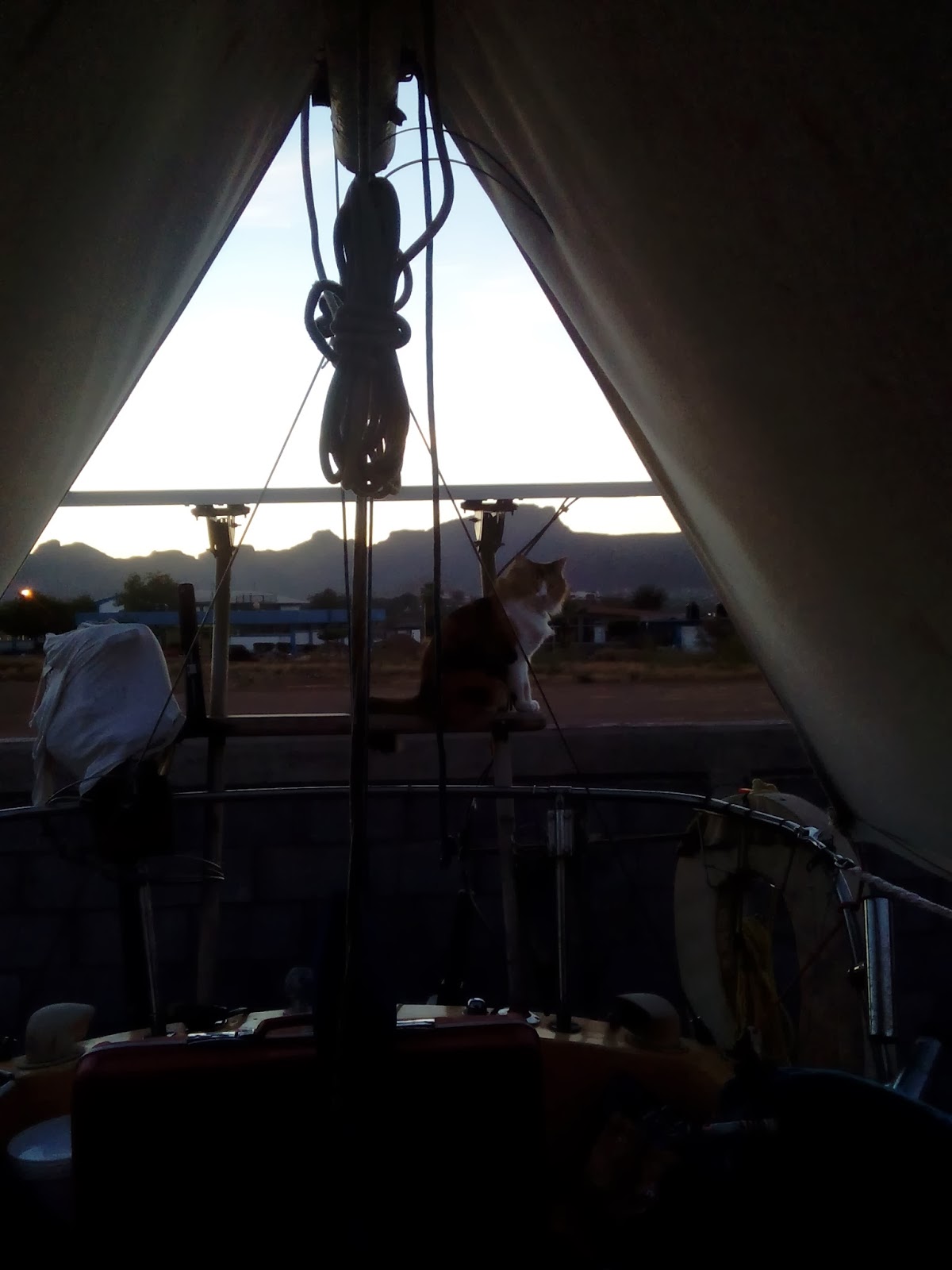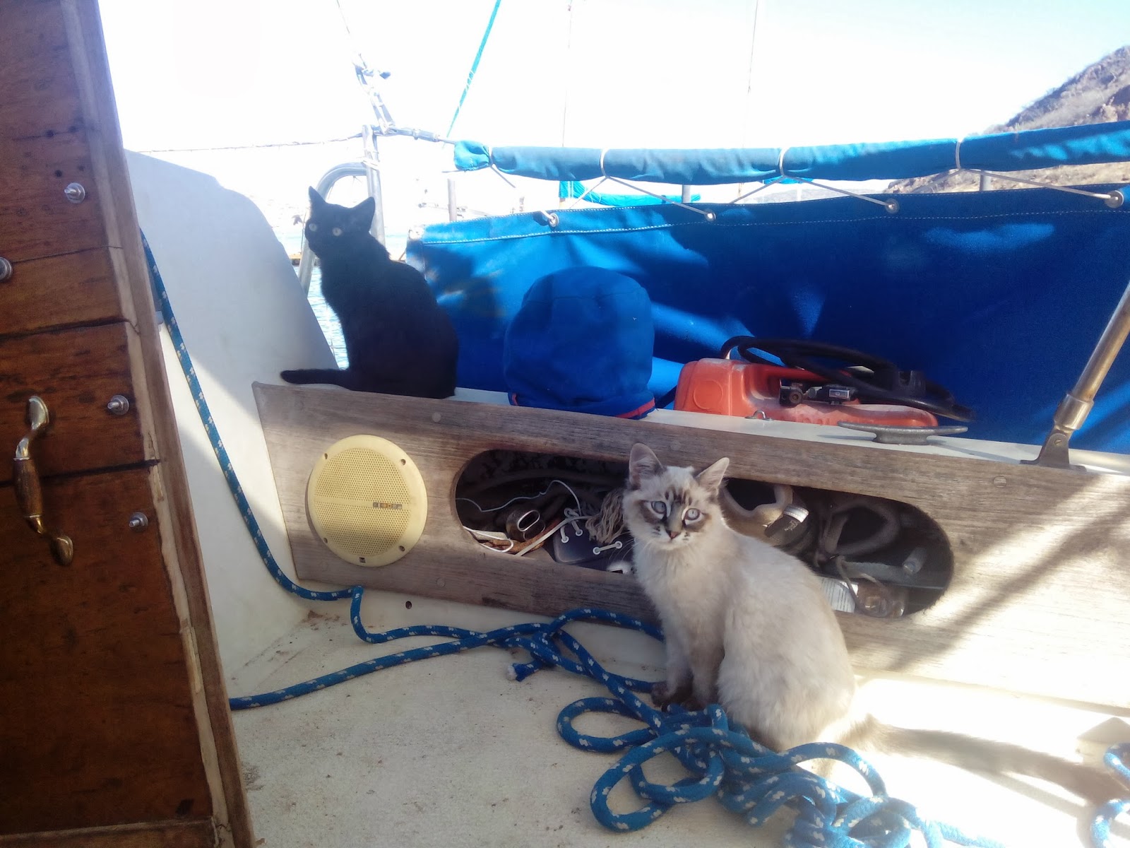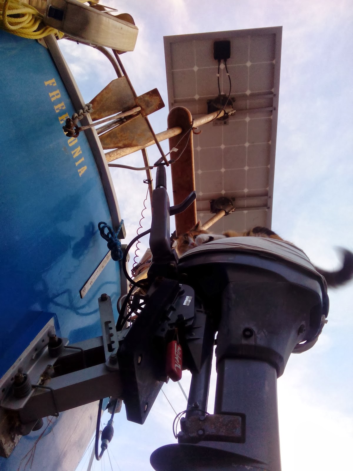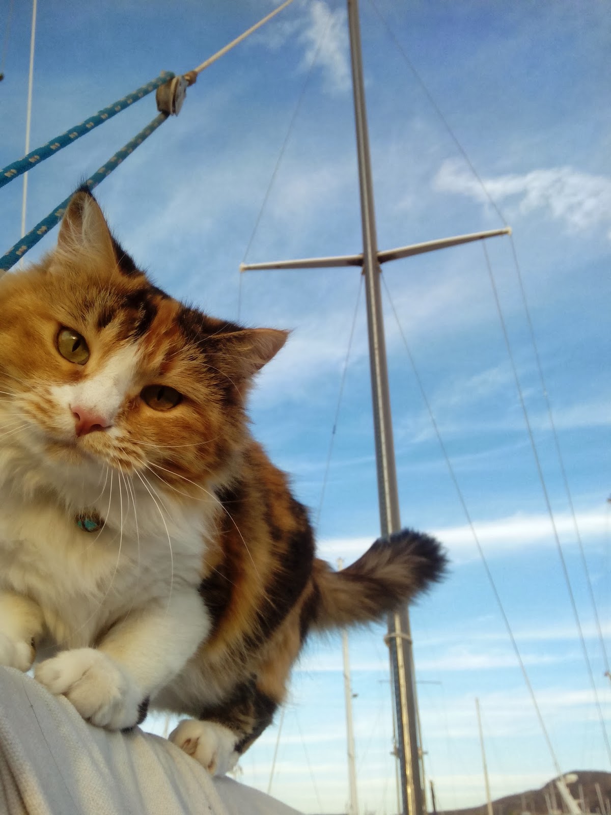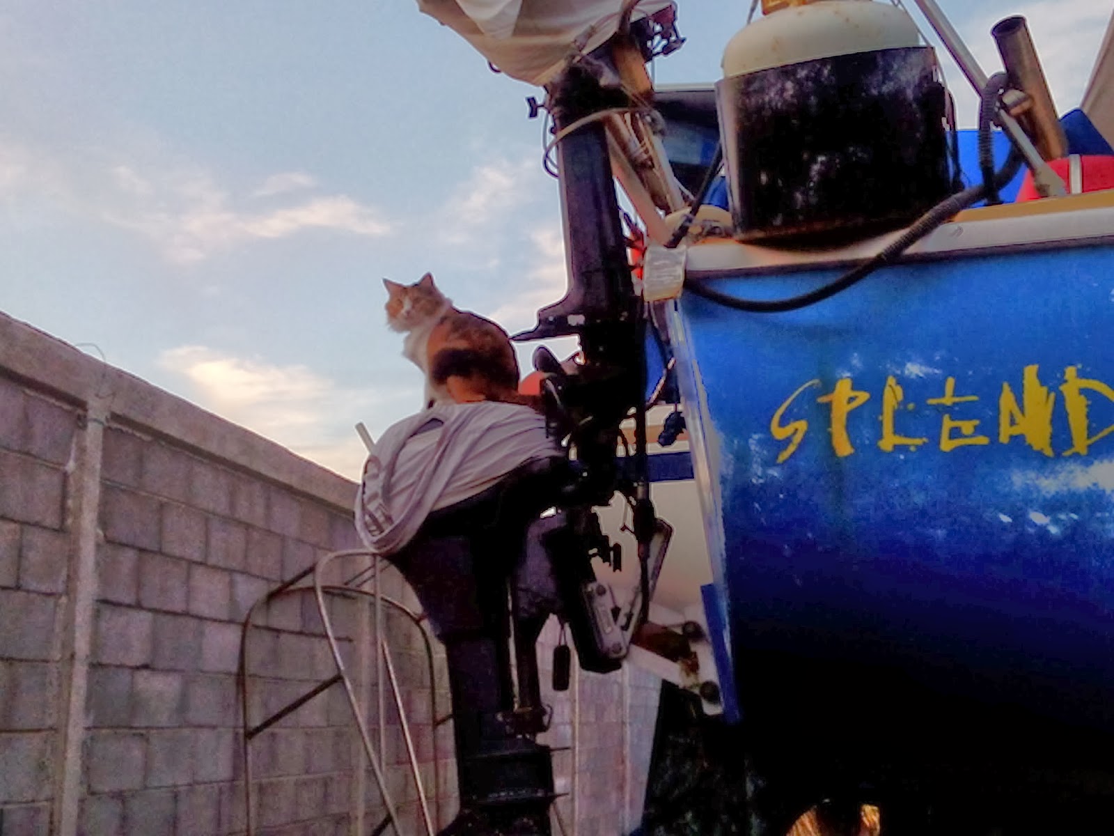 Piña has gotten sick of staying on the boat. She now hops onto the cement wall and walks to other boats, and is starting to brave the ladder and the dirt ground. We must keep a close eye on her though, many shipcats have lost lives and limbs in this yard.