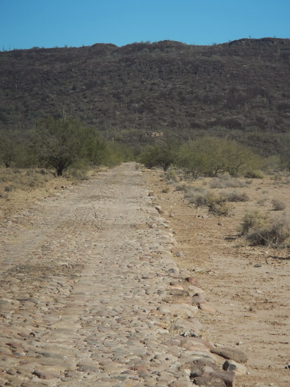 Old cobblestone road in the middle of the desert. Could barely make it out but there’s definitely a very old stone building back there.