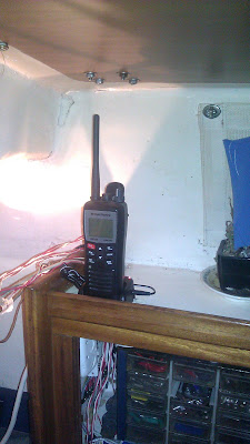 this is where that old cancerous fish/depth finder was mounted. after removing that for Piña to gnaw on, i thought it would be the perfect placement for our handheld VHF. we purchased the west marine vhf155 model for a good price and many features. it’s completely submersible waterproof, floats, has weather alerts, an LED strobe light that blinks SOS when activated, 2 battery packs, charging mount, 12 hr. battery life, plus a 3 yr. warranty.