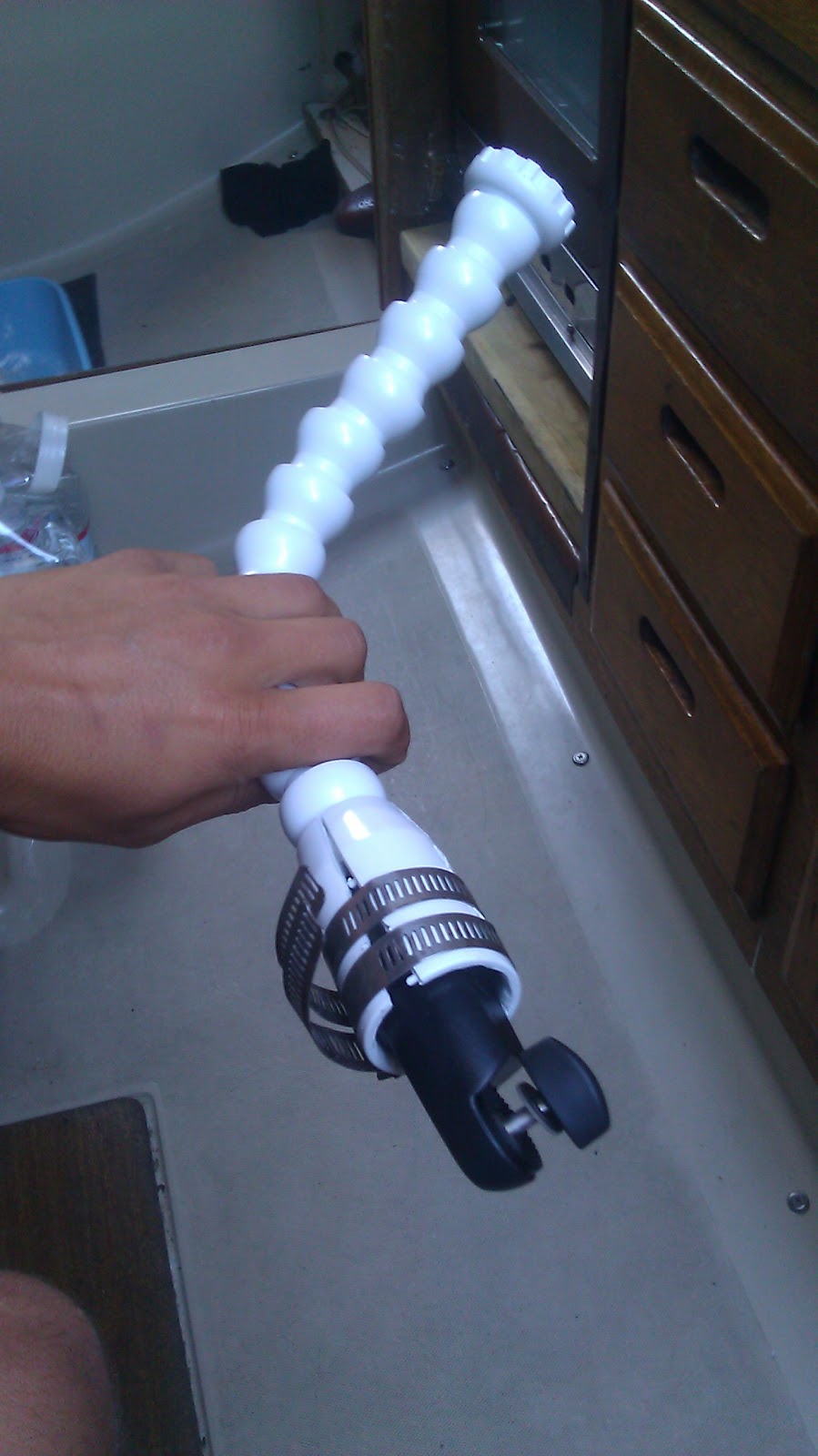 so here is the rough draft version of the wall mount. at this point we are planning on leaving in 3 days for a circumnavigation of Catalina island. not much time to get it done the pretty way so ghetto will have to do for now. when i re-do it i plan on running the wires inside of the flexible white arm so that they aren’t exposed and can pop out the backside of the wall mount and run flush on the ceiling to the circuit board. that way it won’t be exposed to water, weather, Piña, or getting ripped out on accident.