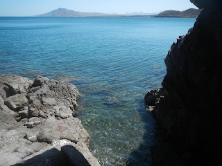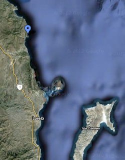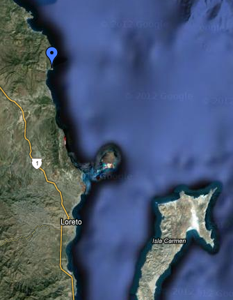 we left carmen, passed isla coronado (photo center). the blue waypoint is punta mangles, san juanico is the cove above it. we turned toward the coast just above coronado and then worked our way up just a 100 yards off the shoreline. not very safe, but also not many options available.