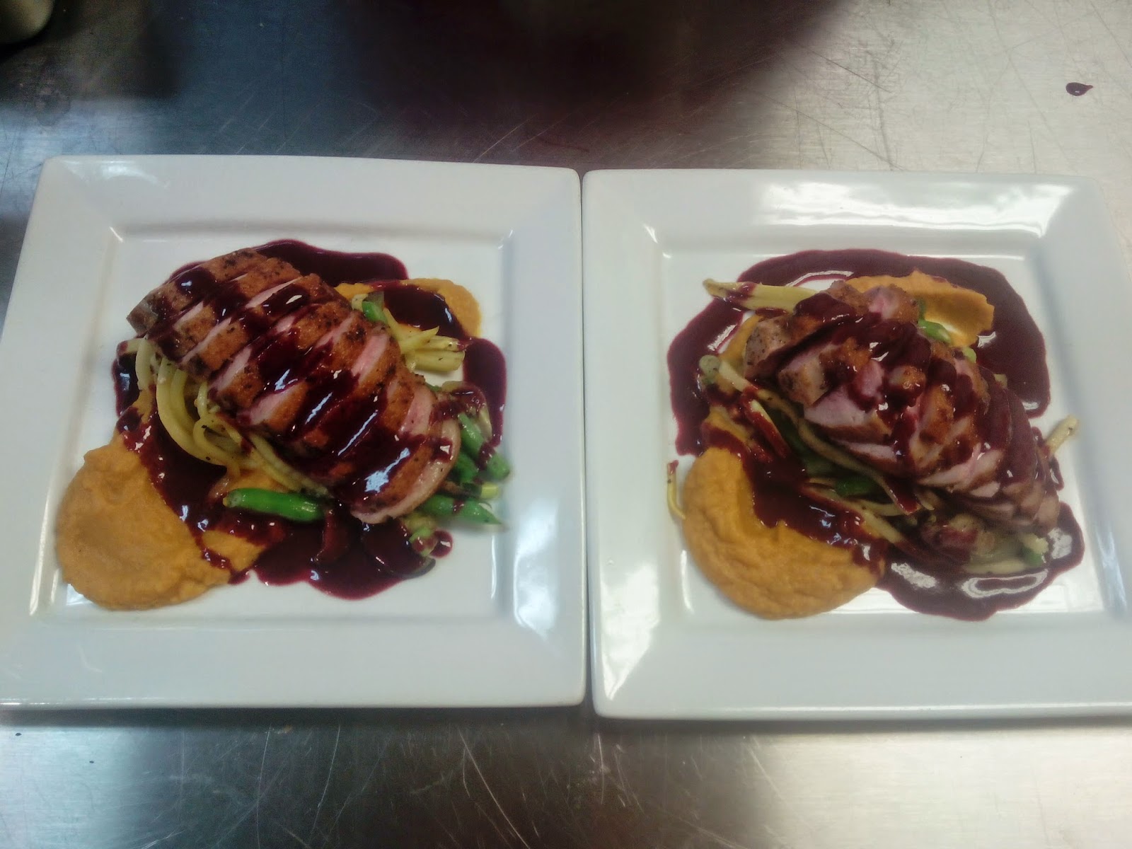 seared duck breast, sweet potato purée, summer squash, blackberry merlot reduction