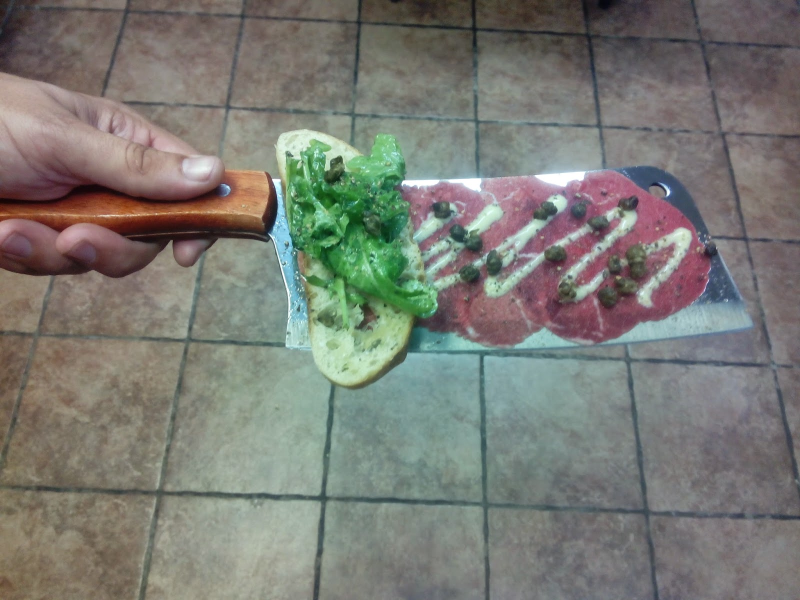 texas beef carpaccio, arugula, fried capers, lemon horseradish vinaigrette
