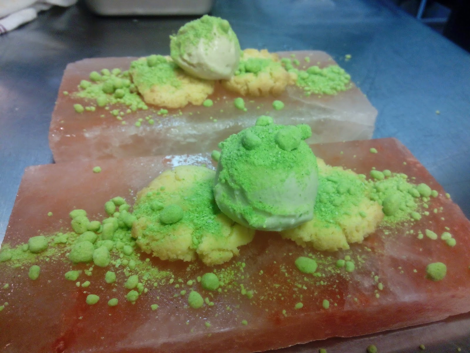 corn icecream, freeze dried corn cookies, sweet pea crumbs on a frozen salt block