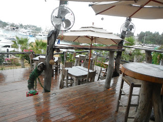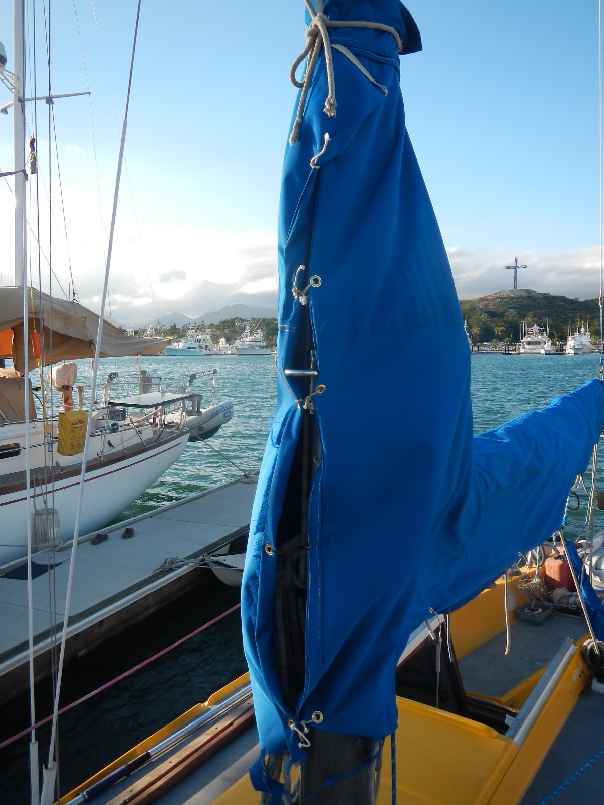 We had a quick motor on calm water to Bahia San Jose del Cabo. ‘Sweet Dreams’ was just ahead of us and ‘Serenity’ was already tucked in there, having left the day before us. We dropped anchor right near ‘Serenity’ on the western end of the bay near the golf course. Saw a small reefy point with a handful of longboarders. Looked pretty fun, about knee to waste high lefts and rights. ‘Sweet Dreams’ had pulled farther down and into the actual harbor to the fuel dock. Claire and I were having lunch, waiting for their intel on the anchor conditions down there. They said it was pretty much the same all around so we pulled up our hook at 14:30 only after being at the west end a few hours. We planned on getting a slip in the morning, we figured we might as well be right outside the breakwall so in the morning we could pull in. We needed to get a slip because Claire had a family emergency and needed to fly home. GranFran isn’t doing too well and it is very important for Claire to be with her family at this time. If you don’t know GranFran, just envision an Angel, that’s her. The good thing with being on the boat, we can pump the brakes when need be, and pause for a moment. We feel more comfortable having the boat in a slip and not on anchor when leaving her unwatched for a long period of time. That night we were invited to a dance party at The Drunken Sailor. ‘Sweet Dreams’ joined us for that one. We had a blast. Good food, good margaritas, good local fun. We met a man named Charlie Moore. 77 years old. Drove his Ford truck down from Pennsylvania with a 14’ O’Day. He is currently living in a tent on a commune style ranch. 12/30 Rainy. Gray day. Glassy clear water. You could see the anchor in the sand as I pulled it up. We moved off the anchorage and got a slip in the marina. It’s weird how things work out with timing. ‘Sweet Dreams’ actually needed to stay put here as well. Noah and Christina are changing paths with Jon and Sara. They are looking for a vehicle to drive back to the states. It works out for me, I don’t have to sit here alone and can hang out with good company. Claire took me on a surprise date to the botanical and succulent garden. We had lunch at The Container, a harborside restaurant. 12/31 we woke up and hopped a bus to the airport. Very sad and hard to see Claire go. Came back and spent New Years eve on ‘Splendid Isolation’ with Noah, Christina, and Rob. Plenty of rum and tequila. We also busted out 2 harmonicas, a kazoo, a maraca, and my fog horn to introduce 2013. WOW…1/1 I spent some time cleaning and organizing the inside of the boat. Then we walked into the downtown area. Very cultural. Definitely california influenced. A lot of the businesses were in pure english. A lot of art shops, culinary arts, craft stores, etc. John and Sara purchased a small inflatable with a mercury outboard. They needed a new ride because Noah and Christina were taking the kayak. Very glad I’m in a slip, it has been extremely windy. 1 /2 I scrubbed the waterline around the boat. It’s crazy how fast it acquires growth in these warm waters. 1 /3 I thought I’d stay productive in the slip so I put new grommets in our boom tent and main sail cover. They were both ripping. Today was also the first time I’ve needed to tilt the solar panel. I noticed the past few days that we were not charging up to regular levels. A lot of bigger sailboats around me were shading my sun. tilting the panel definitely helped. That night I went to Ali’s place with Noah, Christina, and Rob. Local restaurant around the corner. Ali’s restaurant is cabana style. He is quite the retired chef. He’s originally from the Sahara. He speaks 6 languages. French, German, Spanish, English, and 2 Indian type dialects. He has traveled and been a chef all over the world. After a short talk with him about my culinary background and new sailing life. He graciously offered me his restaurant. Thats the second restaurant offered to me in the past 3 months! I have a feeling I will be getting that offer a lot on this voyage. His fish tacos and hamburgers are out of this world. We had a great time drinking too much with him. A few Ali quotes from the evening: “I am what I am. I am Ali of the Sahara!” “ooooh lala” “blub blub blub” “You are to be what you are. To be what you are is nothing else” “wisdom is free to be what you are to be” “lalala, lalale, lalala” After about 4 hours of holding Christina’s hand and mooshing over her, he looks to Noah, “your sister?”  “no. My wife.” “OH!” Me to Ali “Ali can I bring a big jug of red wine here for everyone? Vino rojo?” in his thick accent, “fucking shit, bring it!” it was quite the evening. From smashing glass vases to Ali ending up with no pants on blacked out. That was our queue to leave…BURRACHO. ¡FELIZ Año! 1 /4 I got up with Jon and Sara who had been cleaning their boat for days and told them it was time for a break. We went out to the beach by the SW breakwall. The skim was surprisingly awesome! Very very steep beach. Coming in clear and warm, waste high, chest high sets. Wraps and lines. It’s nice to be skimboarding again, especially on these empty beaches. If you could only see my sweet maneuvers. I even shock myself sometimes. Noah and Christina picked up a Bronco on craigslist for a steal. They packed that thing up with everything they own and are camping out on the beach. 1 /5 I pulled out of the slip and anchored 13:30 on the NE side of the breakwall to save some money. Definitely not as luxurious or comfortable as being in a slip, but we have a tight budget to keep in mind. Hopefully the weather stays nice enough to sit here until Tuesday when Claire returns. I will be getting a slip again for that airport run and her first night back. Once she gets back we should be sailing onward, 30ish miles to Cabo los Frailes.