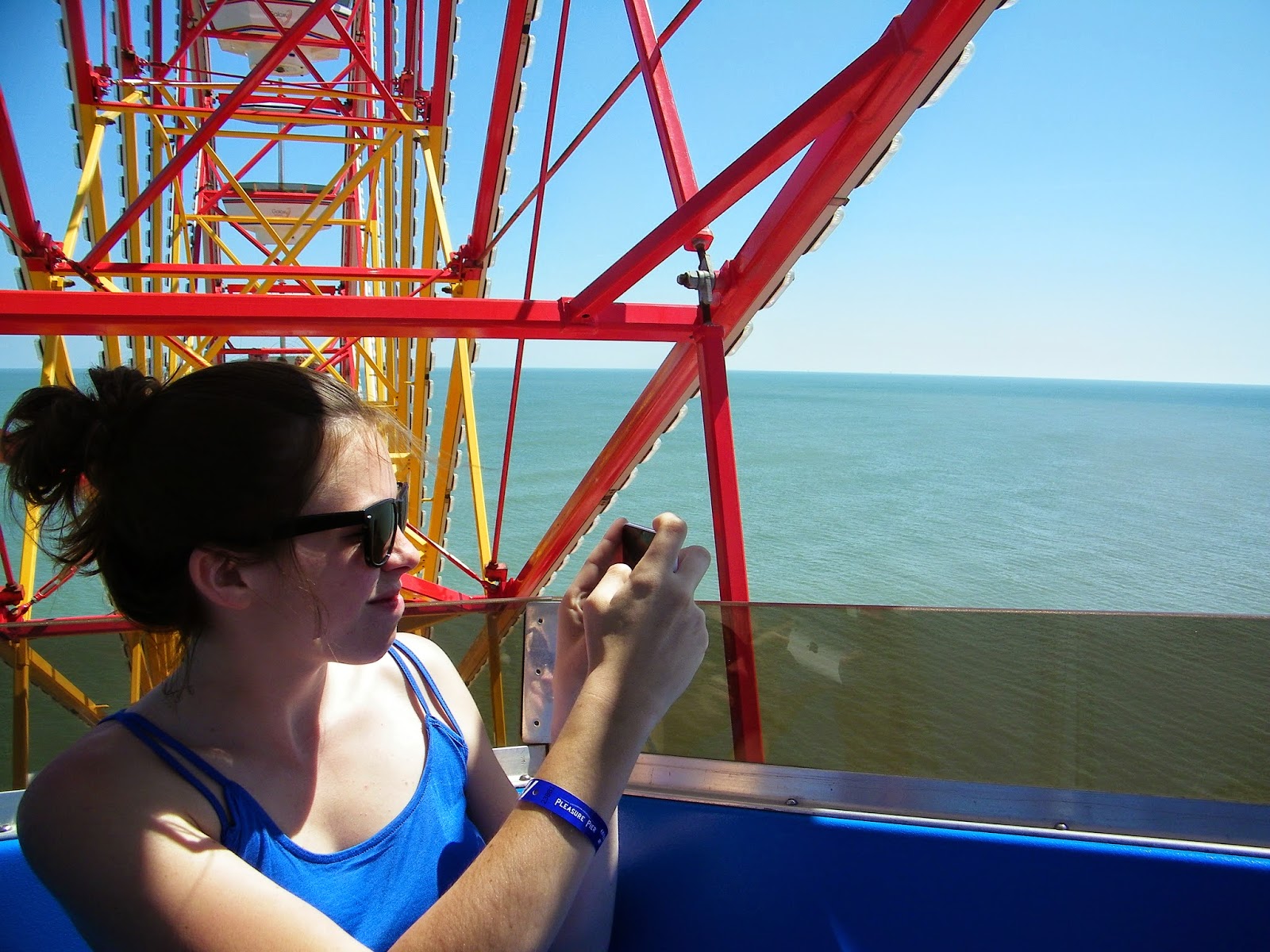 Monica snapping shots of the crowded beach and seawall.