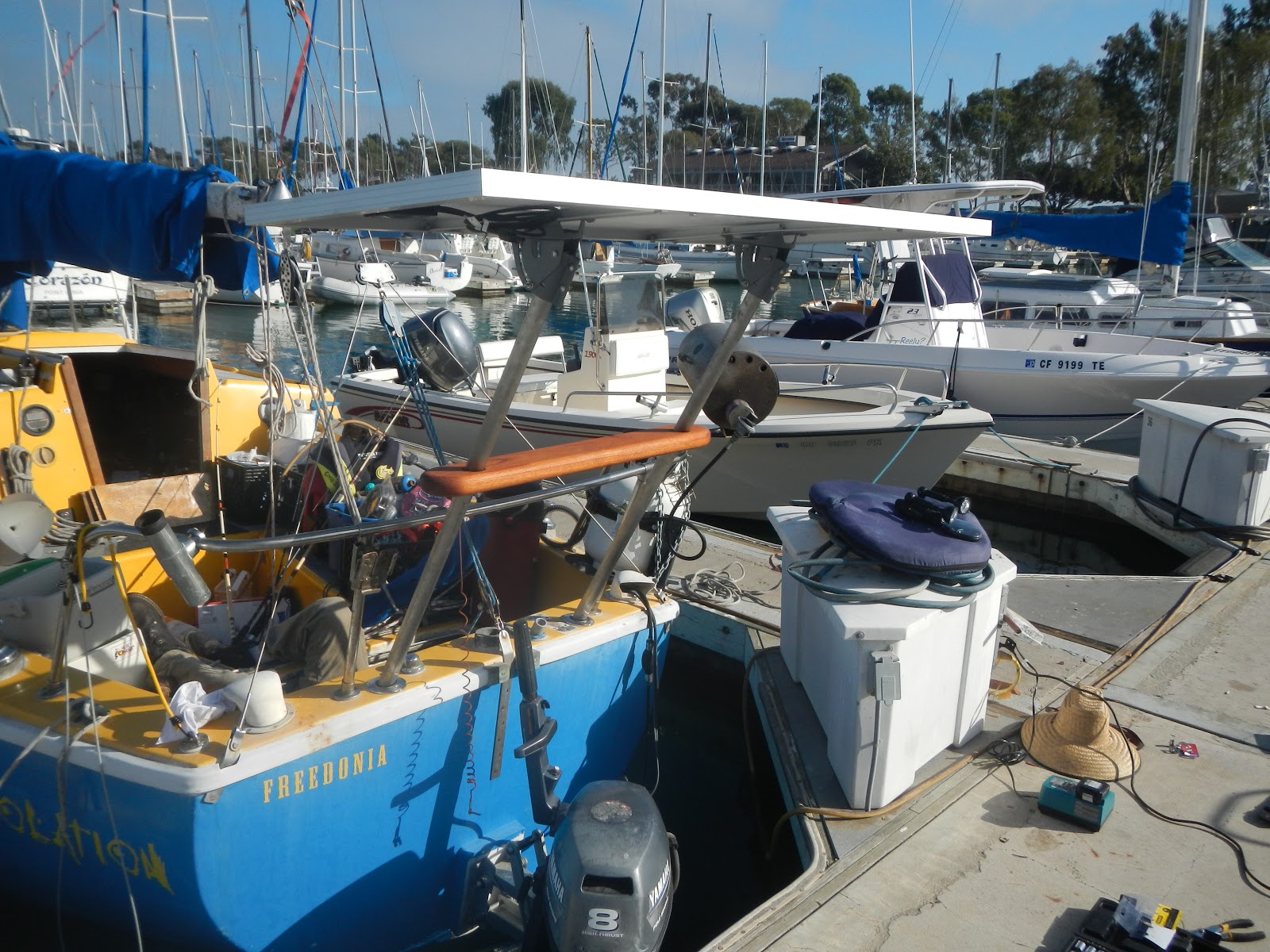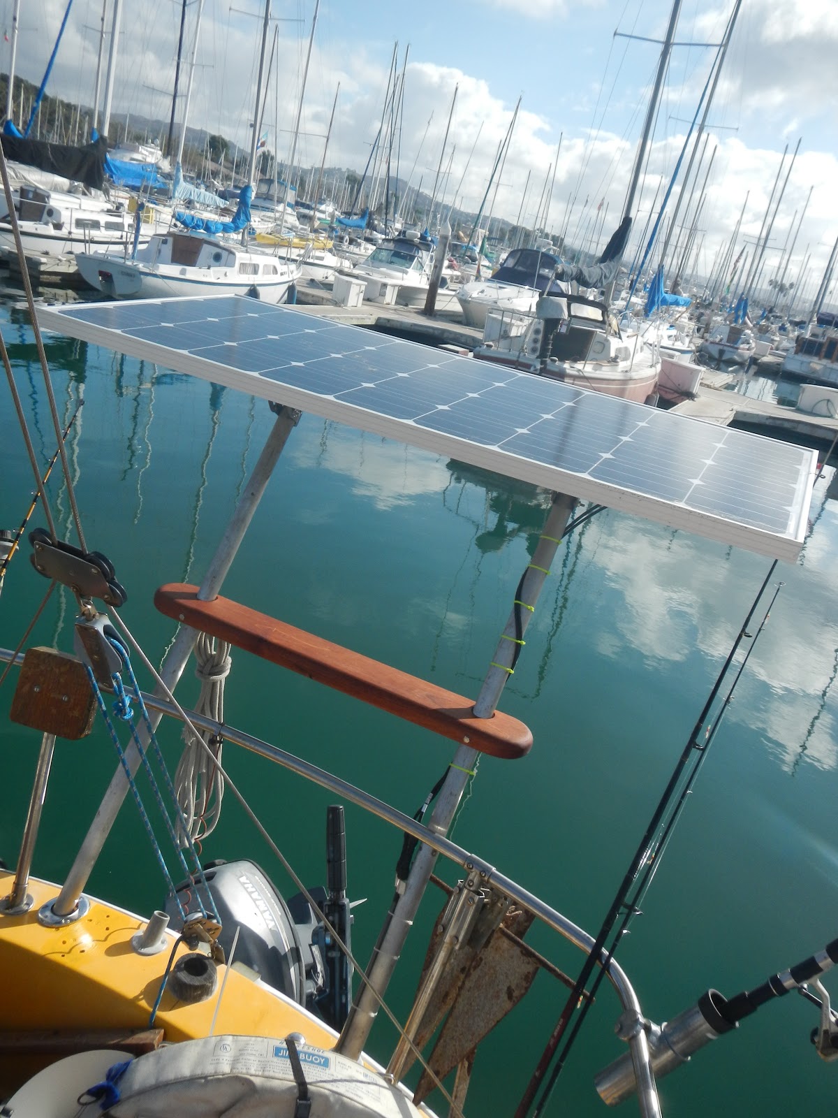ok we’ve been slowly piecing our solar set up together since january. we bought the xantrex c40 charge controller, cable wires, and the 2 monster batteries when we bought our port-a-bote from some guy off craigslist. we bought our 140watt solar cynergy and MC4 cable connects in august. while my dad was out here visiting last time we started building.