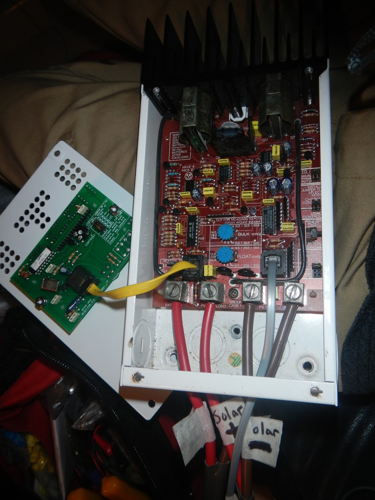 ok we’ve been slowly piecing our solar set up together since january. we bought the xantrex c40 charge controller, cable wires, and the 2 monster batteries when we bought our port-a-bote from some guy off craigslist. we bought our 140watt solar cynergy and MC4 cable connects in august. while my dad was out here visiting last time we started building.